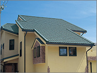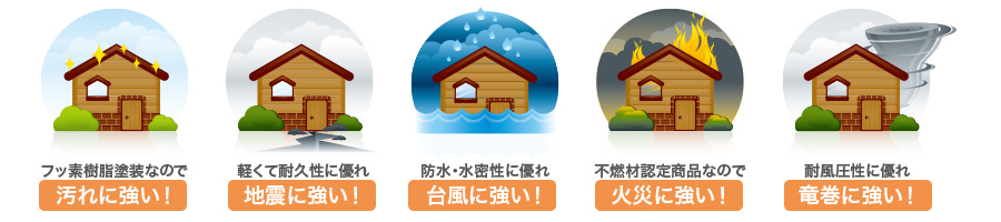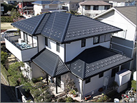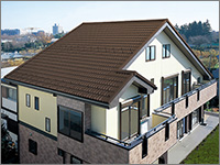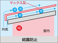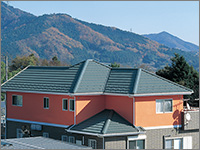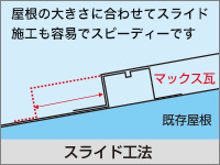 ROOF屋根リフォーム工事 BUSINESS 当社はマックス建材株式会社の 「マックス瓦・マックススター・レクトルーフ」を採用しています。 マックス瓦・マックススター・レクトルーフは、独自の新技術で数々の特許を取得しています。また、高性能を実証するために、過酷な環境を想定した様々な性能試験を行っています。 ホーム » 屋根リフォーム工事 ガルバリウム鋼板 マックス瓦は、その基材にガルバリウム鋼板を使用しています。ガルバリウム鋼板は、アルミ55%と亜鉛43%による合金メッキ鋼板で、耐蝕性・耐久性・耐熱性にも優れています。燃焼試験では、750度で10分間の試験に合格し、国土交通大臣認定の不燃材として登録されています。不燃材認定番号:NM-8697 フッ素樹脂塗装 表面は、あらゆる面で他の塗料より優れ、汚れに強いフッ素樹脂を塗装しています。マックス瓦は、フッ素含有率を85%にまで高めた、ハイフッ素塗装を実現。メンテナンスフリーで、いつまでも光沢のある美しさを保ちます。※マックススター、レクトルーフは50%フッ素塗装 通気構造 自然対流による通気を可能にした新技術 「通気構造」空気流通層の熱貫流効果によって屋根材裏の空気が循環し、既存屋根下を外気温とほぼ同じに保つ事ができます。断冷熱効果を向上させ、結露防止にすぐれた威力を発揮します。夏は涼しく冬は暖かで、省エネにも効果抜群です。 結露防止効果 他社製品のように横桟木による施工では、結露が発生しやすく、下地の腐食が心配です。(上図)マックス瓦は縦桟木による施工なので、外気が流通でき、結露が起こりません。(下図) 毛細管現象防止 マックス瓦の特殊構造は、独自の形状により伝い上がってくる雨を阻止し、毛細管現象が原因となる雨漏りからも大切な家屋を守ります。 スライド工法 マックス瓦のスライド工法は、本体同士の重なる部分をスライドさせることによって、等間隔に美しく葺きあげます。施工の自由度が高いため、あらゆる形状の屋根に施工することができます。工事中の住み替えも不要なので、お客様に余計なご負担をかけません。 スライド工法 マックス瓦のスライド工法は、本体同士の重なる部分をスライドさせることによって、等間隔に美しく葺きあげます。施工の自由度が高いため、あらゆる形状の屋根に施工することができます。工事中の住み替えも不要なので、お客様に余計なご負担をかけません。 施工事例